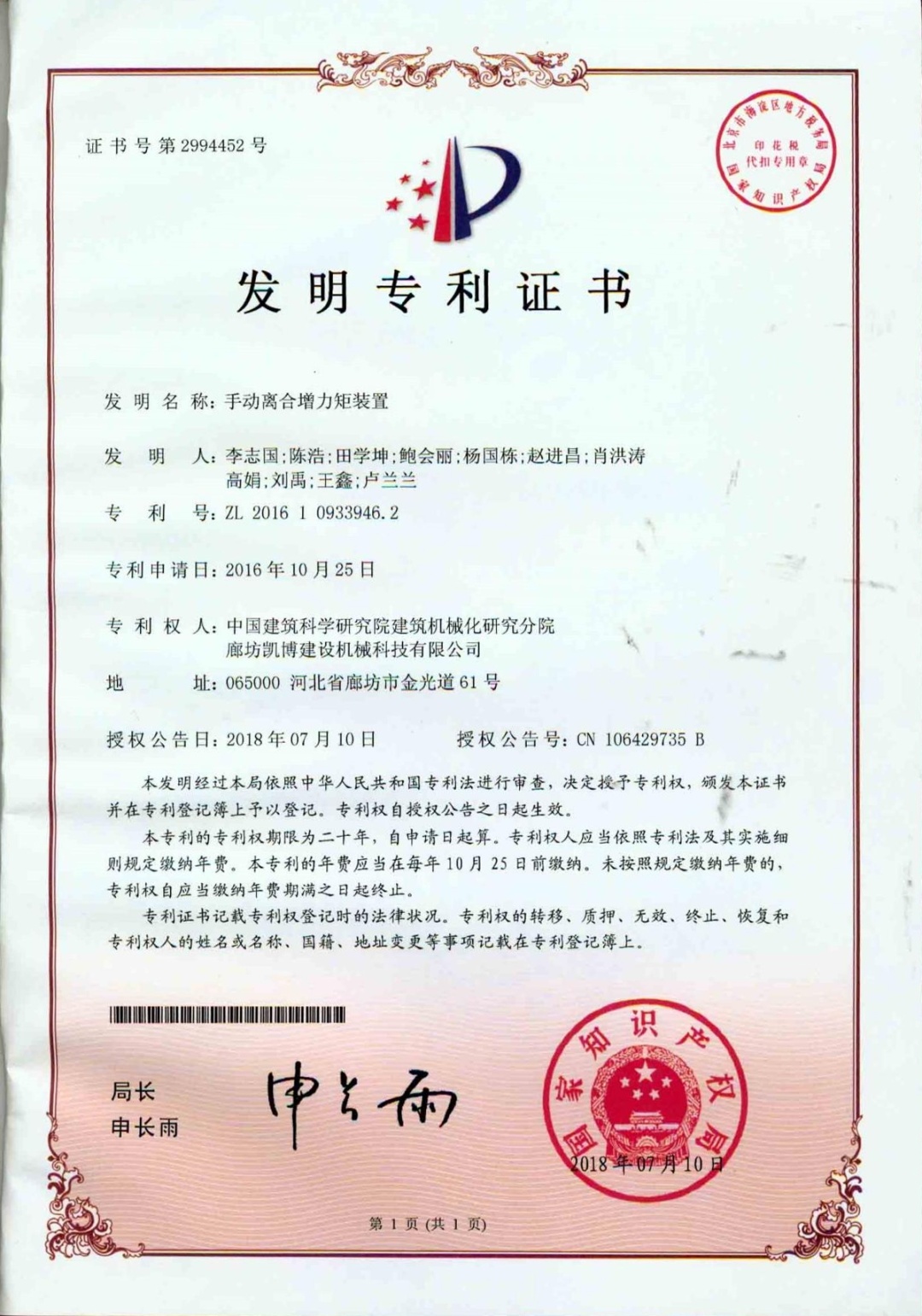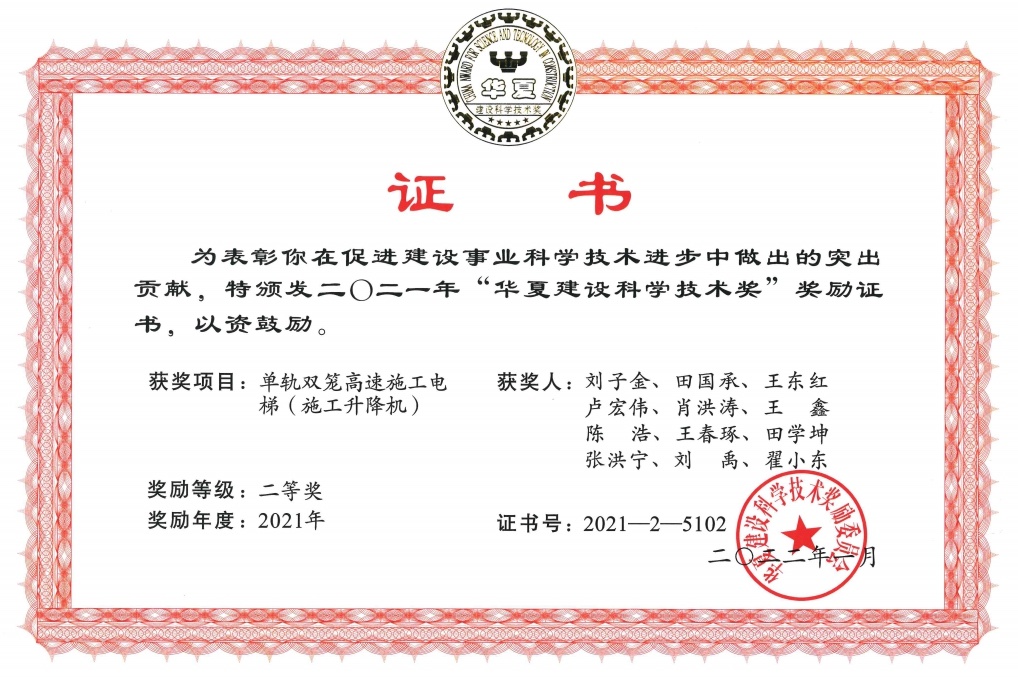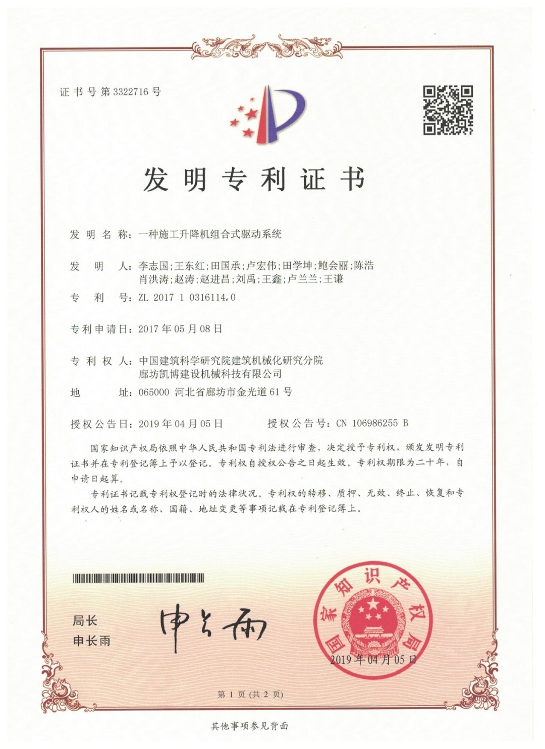 ? ? ? ? ? 本產(chǎn)品獲2項發(fā)明專利——施工升降機組合式驅(qū)動系統(tǒng)(專利編號:ZL201710316114.0)和手動離合增力矩裝置(專利編號:ZL201610933946.2);主編參編GB/T37537-2019《施工升降機安全監(jiān)控系統(tǒng)》、GB/T 26557《吊籠有垂直導(dǎo)向的人貨兩用施工升降機》兩項國家標準;2021年榮獲“華夏建設(shè)科學(xué)技術(shù)獎”二等獎。為解決我國超高層建筑人員物料垂直運輸?shù)母咝О踩椒€(wěn)運行難題提供了強有力的技術(shù)支撐。